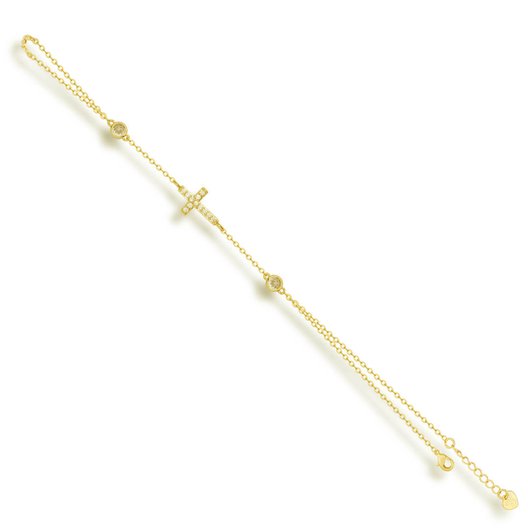 Elevate your style with our Don’t Cross Me Hand Chain! This exquisite hand chain features a dazzling pav?? cross and two bezel stones. adding a touch of elegance and edge to any outfit. Accessorize with confidence and make a statement with this must-have piece.